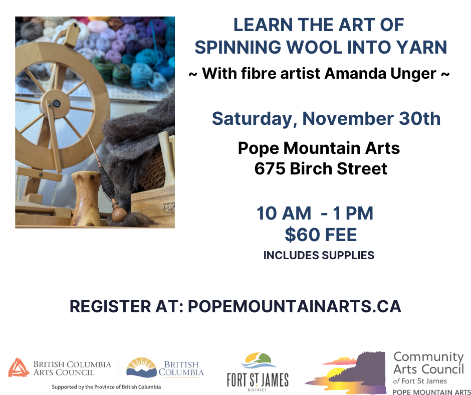 Back to All Events The Art of Spinning Wool into Yarn Saturday, November 30, 2024 10:00 a.m. 1:00 p.m. Pope Mountain Arts 675 Birch Street Fort St. James, BC Canada (map) Google Calendar ICS In this workshop, you will learn how to spin prepared fleece into yarn and receive a basic introduction to the process of turning shorn sheep fleece into finished garments. Name * First Name Last Name Email and phone number * The Art of Spinning Wool into Yarn Message Thank you for your interest in this workshop. We will be in touch shortly to confirm your registration and payment options.